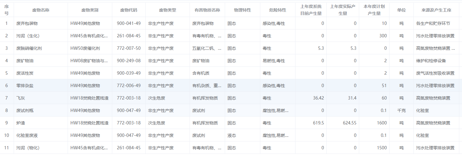 危廢種類:廢棄包裝物、污泥(物化)、廢脫銷催化劑、污泥(生化)、廢礦物油、廢活性炭、零排雜鹽、飛灰、廢試劑瓶、化驗(yàn)室廢液、爐渣。
